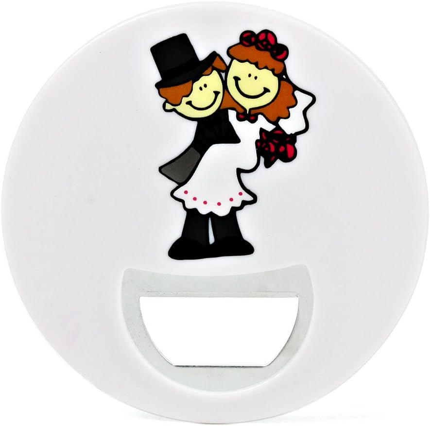 Looking for an elegant yet practical wedding favor for your Big Day? Look no further. OnePlace Gifts Exclusive Gift Boxed Round Bottle Opener is for you to wow your wedding joiners. Your guests will use this bottle opener and treasure it as a memento keepsake from you in years to come. Features double sided print of the cartoonized wedding couples on its pure white surface constructed of ABS material, durable stainless steel beer bottle opener, embedded magnet at the back that make it handy to stay on fridge, nicely packaged in a blossom loving tree themed gift box, tied with chocolate brown ribbon and hung with an antique silver Key shaped metal tag.