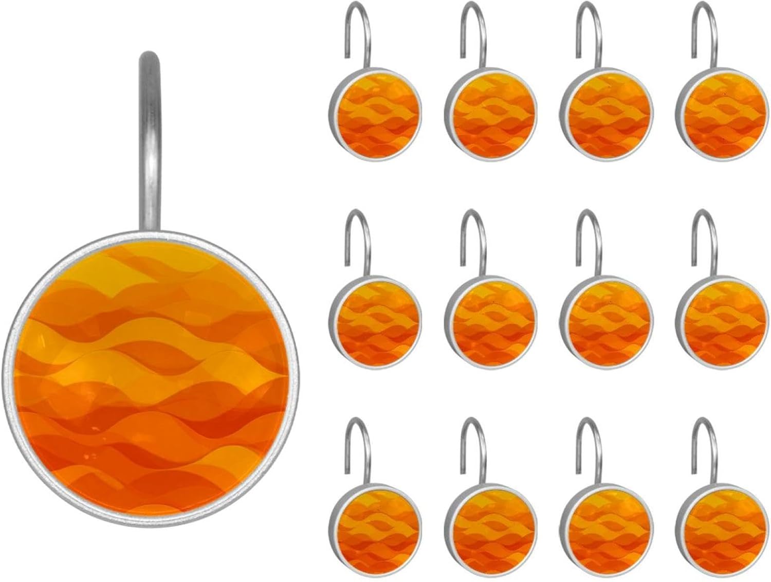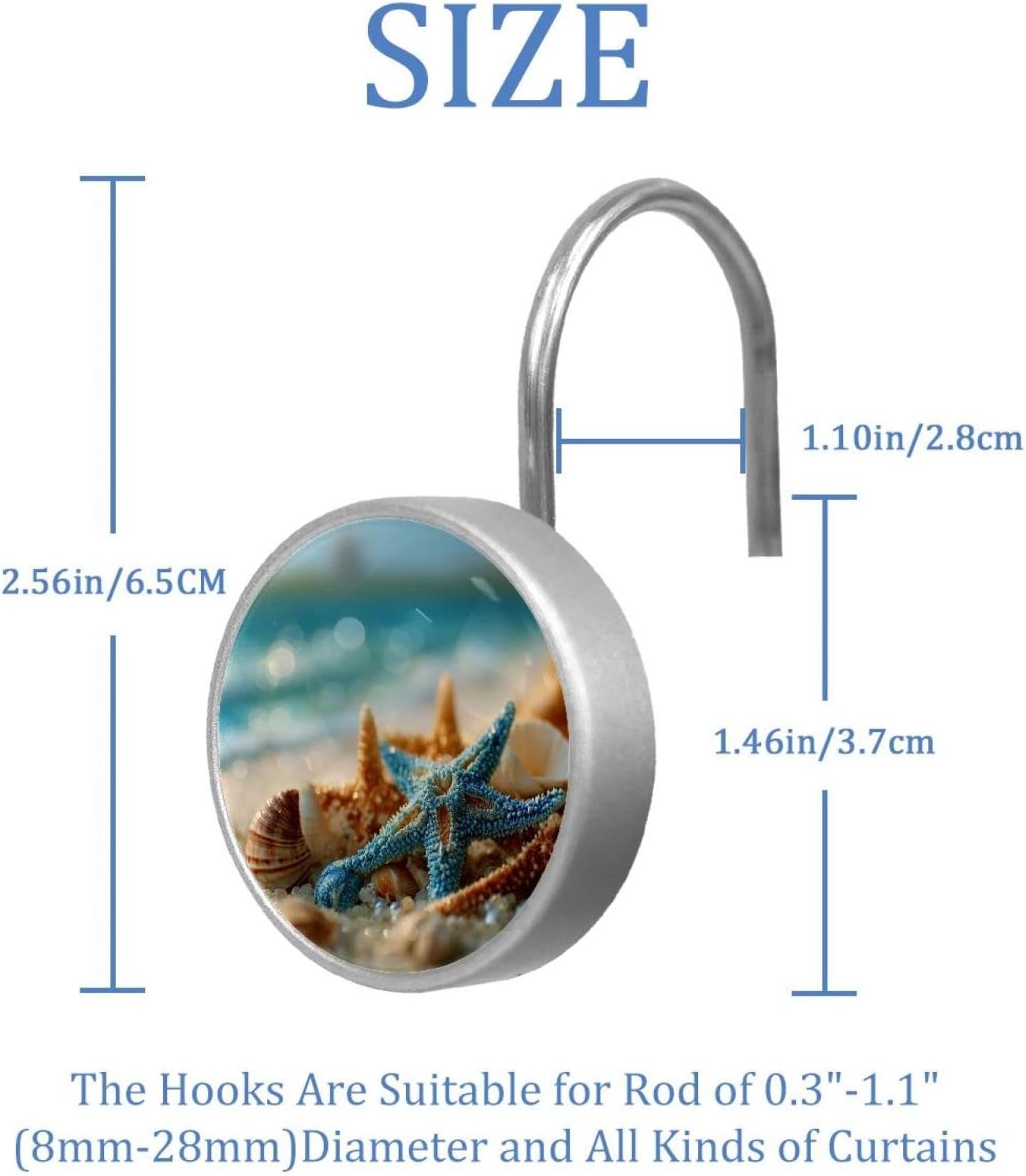 MATERIAL: glass, stainless steel. These shower curtain hooks can be decoration bathroom and will be long-lasting.12 pieces of shower curtain hooks, round crystal glass decoration, printed patterns, silver hooks to match various styles of bathroom shower curtains. SIZE: Crystal glass diameter of round shower curtain hook is 1.45x1.45in/ 3.7x3.7cm. The shower curtain hooks diameter is about 1.1in, 12 pieces shower curtain hooks are suitable for rod of 8-28mm(0.3"-1.1"). RUST RESISTANT:Shower hooks are made of stainless steel and crystal glass, which is durable, rust-proof and corrosion-resistant, it will not rust suitable for wet bathroom environment. EASY TO INSTALL:Hand the shower curtain hooks hold securely on straight or curved shower curtain rods,slid easily and smoothly. Easy to install and decorate your bathroom. BEAUTIFUL AND ELEGANT:Beautiful Love hook add charming scenery for your bathroom, baby room, bedroom, living room, and the gorgeous style is easy to match with any kinds of bathroom shower curtain. EASY GLIDE: Open and close your shower curtain quickly and easily with the Shower Hooks, easily glides on shower curtain rods and tension rods. No snagging; no effort; no hassle PACKAGE: 12 shower curtain hooks in a pack.The bathroom curtain hook has a smooth appearance and can be hung on the pole to pull it at will. Special price 12 sets to meet your needs.