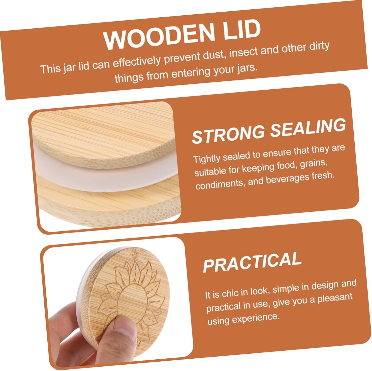 Package List 16 x jar lids Features -Material: Wood jar wooden lid - This jar lid can , and other dirty things from your jars wood lid. - It is chic in look, simple and in use, give you a pleasant using experience jar lids. - You can use these wooden lids to create your own glass jar for storage purpose or drinking needs glass jar lids. - It is helpful for you to store honey, tea, yogurt, juice, spice, cookies and much more wooden lid. - These lids work great with types of jars, like glass jars, plastic jars and metal jars lids.Goods Descriptionjar wooden lid Decorated with sunflower pattern, these jar lids look so pretty and chic, easily winning the favors of people.wood lid These jar lids are made of natural wood material, and to use, not easy to fade or break,