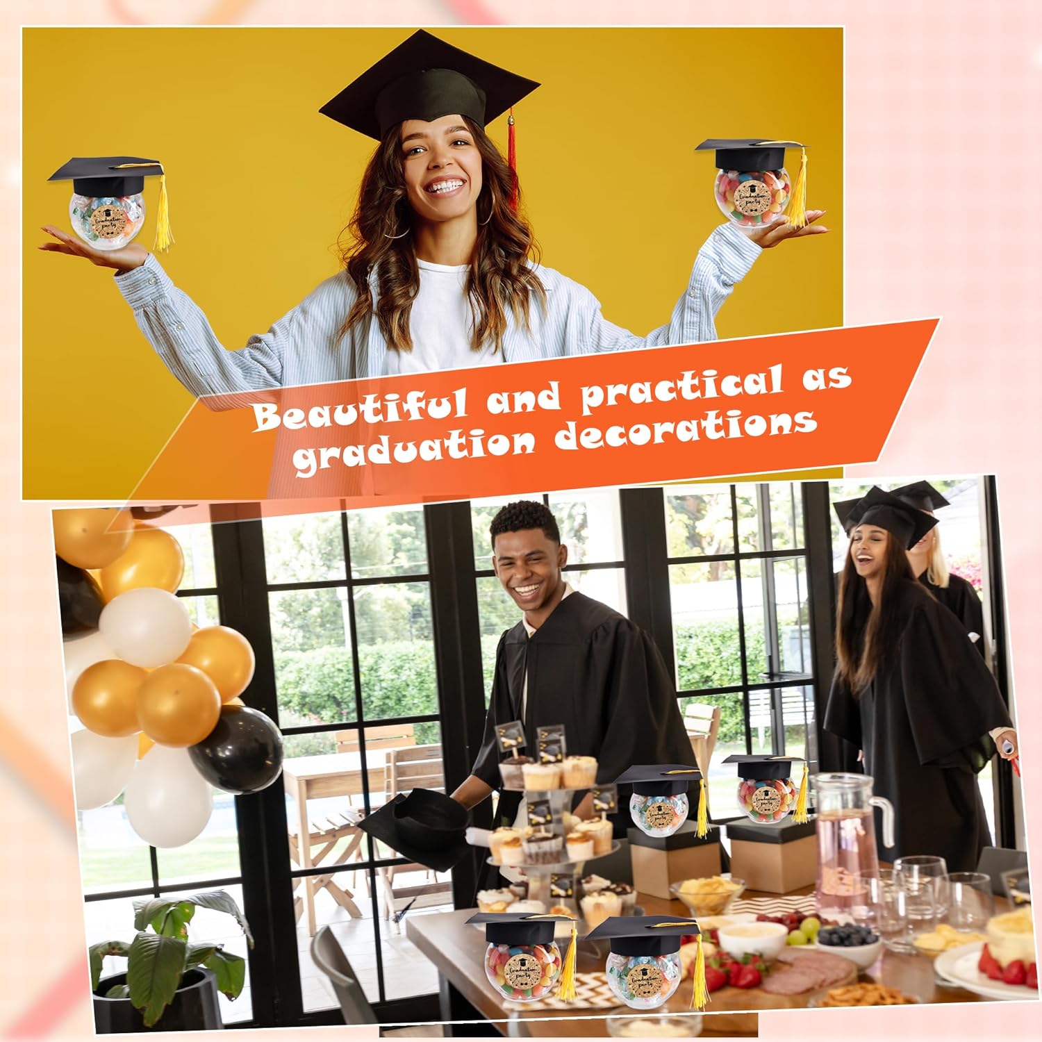 Graduation Candy Bottle Set Occasion: These graduation candy gift boxes are perfect as gifts for graduation party ceremonies. Whether it's a birthday celebration or a party that creates an unforgettable theme atmosphere, this gift box can be given as a present Graduation Candy Bottle Set Feature: Material: robust cardboard Size: The height of the candy bottle is 8 cm/ 3.1 inches, and the diameter is 5.5 cm/ 2.2 inches Quantity: 220 Pcs Package Include: 50 Pcs graduation candy bottles 50 Pcs fringed hats 120 Pcs stickers