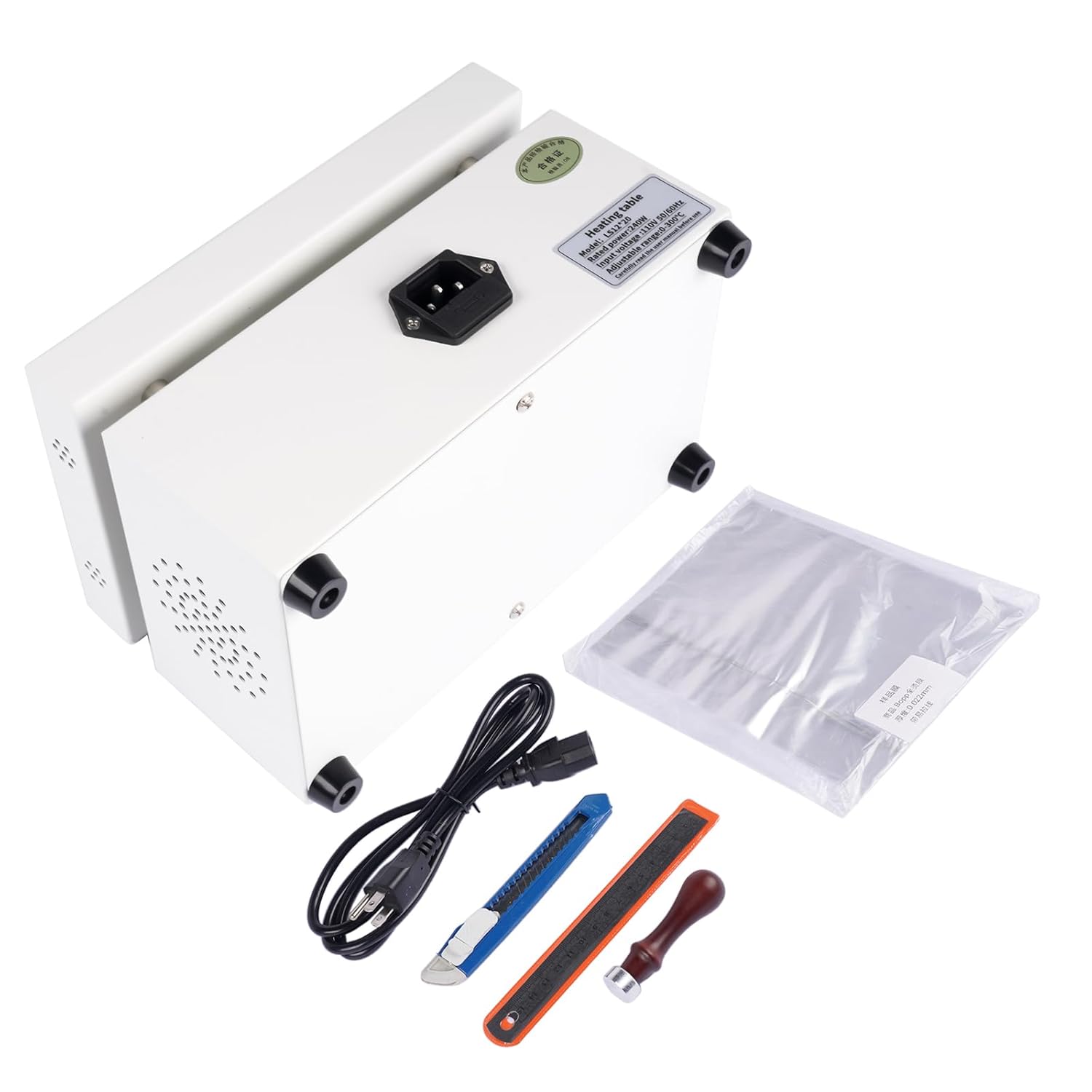 Key AccessoriesBOPP film with easy to tear stripStamping headRulerUtility knifeTechnical SpecificationsProduct Model: LS12x20Effective Work Area: 12 x 20 cmPower: 240WAdjustable Temp: 0 - 300°CVoltage: 220V
