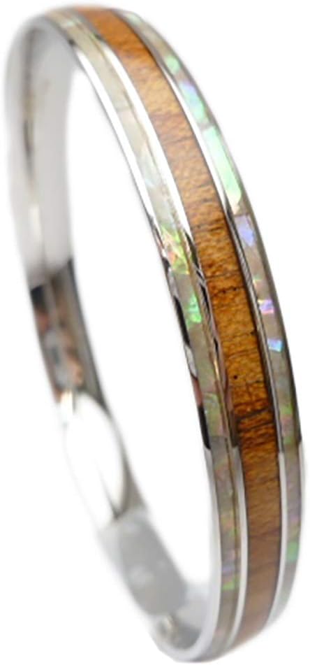 For those who appreciates fashion and nature, this bangle bracelet is an elegant and chic choice. Created in stainless steel, this slip-on style features a unique polished white abalone shell and koa wood inlay. You get the best of both world, from land to sea. Comfort fit bands are crafted using extra metal to make the inside of the band slightly domed, resulting in a very comfortable fit. They are easier to squeeze over a large knuckle when putting on or taking it off, and it's much more comfortable to wear once it's on. This design comes in 8mm, 10mm in width. 7.5" , 8" and 8.5" in size (circumference).