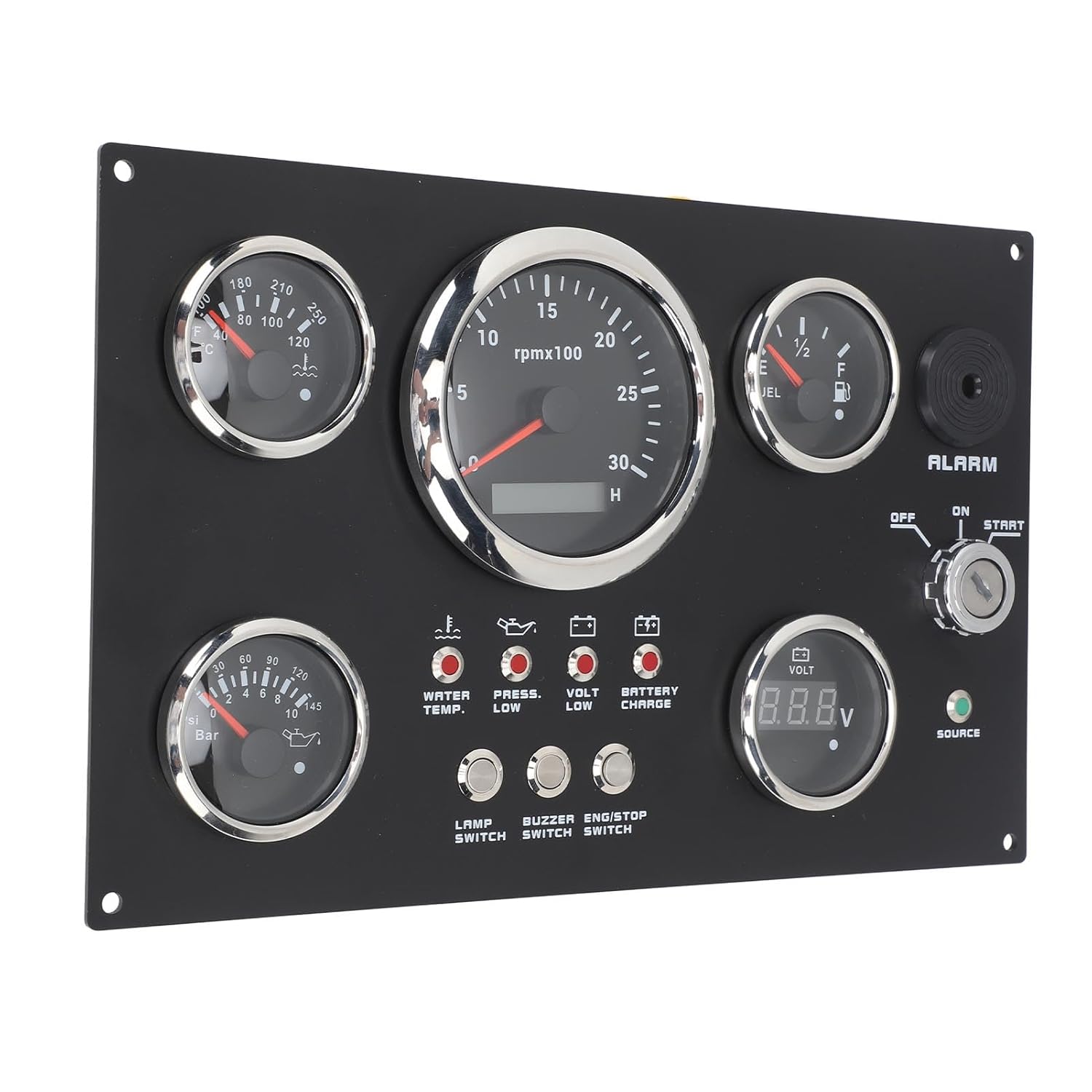 Specification: Item Type: Instrument Panel Gauge Set Material: Stainless steel +ABS Central control modified instrument panel, with oil level, water temperature, voltage, oil pressure, engine tachometer, with light switch, overload alarm light function This instrument panel can be installed in the control of your yacht, and the status of the engine can be kept informed by the data of the instrument Power on Backlight Color: Red backlight for other four meters (except center tachometer) Uniform red backlight after running, you can turn on and off the backlight by button operation Volt Gauge Sizes: Approx. 52mm (2-1/16in) Measuring Range: 9- 32 (V) Fuel Level Gauge Sizes: Approx. 52mm (2-1/16in) Measuring Range: Empty - Full Resistance: 240 (E) - 33 (F) ohms Sweep: 90 Degree Water Temperature Gauge Sizes: Approx. 52mm (2-1/16in) Measuring Range: 40 - 120 (°C) / 100 - 250 (°F) Sweep: 90 Degree With Water Temperature Sensor Oil Pressure Gauge Sizes: Approx. 52mm (2-1/16in) Measuring Range: 0 - 10 (BAR) / 0 - 145 (PSI) Sweep: 90 Degree With Oil Pressure Sensor Tachometer Sizes: Approx. 85mm (3-3/8in) Measuring Range: 0 - 3000 (RPM) Sweep: 270 Degree Fitment: Suitable for Marine yachts 24V PackageList: 1 x Set of Instrument Panel (Include:1xTachometer, 1xWater Temperature Gauge, 1x Oil Pressure Gauge, 1x Oil Level Gauge, 1x Voltmeter) 1 x Instruction Manual 2 x Keys