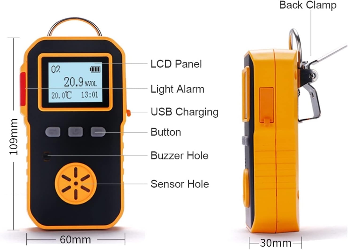 Gas Detector Portable O2with Sound+Light+Shock AlarmWater, Dust & Explosion ProofProfessionalAir Gas AnalyzerFeatures:Product description:Gas type: O2Gas detectorGas measurement range:0-30%VOLResolution: 1%VOL3 Alarm methods : Sound Alarm, Light flashing, Vibrating alert, adjustable alarm values, alarm sound up to 80dbOperating temperature: -20-50(except LEL is 0~40C)<;95%RH (no dew)Display: 2.0inch HD displayPower: 3.7V li-battery(Built-in)Battery runtime: 10hours or so.Product Net Weight : 227g (with battery)Size : 100mm×60mm×30mm (L × W × H)Explosion-proof mark: Exib IIB T3 GbProtection class: ip65Record storage: 1000 groups of alarm recordsProduct Size:130mm×67mm×30mm (L × W × H)Package Weight: 1000g1 x O2gas monitor1 x English User manual1 x Charging adaptor1 x USB charging cable1 x Calibration cover1 x Metal aluminum box