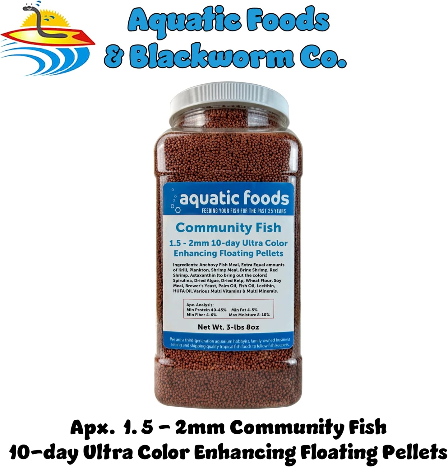 Aquatic Foods & Blackworm Co. Community Fish Ultra-Intense 7-10 day Color Enhancing Floating Pellets (Apx. 1.5 - 2mm)Ingredients: Anchovy Fish Meal, Extra equal amounts of Krill, Plankton, Shrimp Meal, Brine Shrimp, Red Shrimp. Astaxanthin (to bring out the colors) Spirulina, Dried Algae, Dried Kelp, Wheat Flour, Soy Meal Brewer’s, Yeast Palm Oil, Fish Oil, Lecithin, HUFA oil, Various Multi Vitamins & Multi Minerals.Apx. Analysis:Protein 40-45%Fat 4-5%Fiber 4-6%Moisture 8-10%