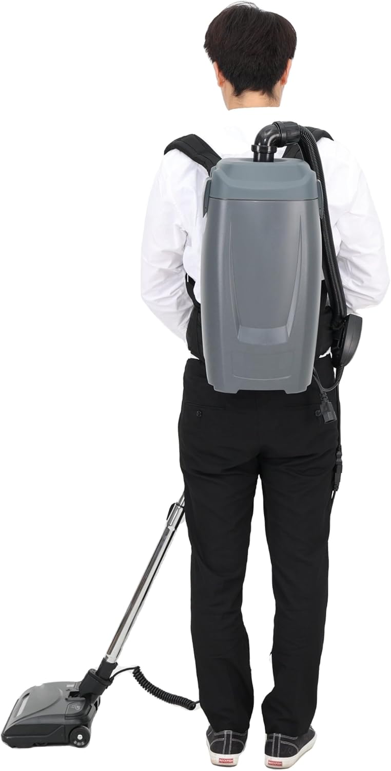 HHQ Ergonomic Backpack Vacuum Cleaner, Premium Bundle with 10 Filters - 6 Quart HEPA Filter, 1100W Portable Small Vacuum for Mixed-Use - Including: 6' Hose, Blower Nozzles, Wand, Brushes.This is the model designed for professional cleaners, janitors, custodians for cleaning office, restaurants, and commercial spaces. PERFECT FOR PET OWNERS: The mini turbo head effectively removes pet hair and dander.FILTRATION - Advanced filtration system captures and contains microscopic dust preventing them from being reintroduced back into the environment.PRODUCTIVITY - Cleans carpets and hard surfaces without stirring up dust, plus backpack vacuums are proven to clean more in less time and with less operator fatigue.Featuring adjustable backpack straps and a telescopic wand, this vacuum fits any user comfortably, ensuring ease of use during extended cleaning sessions.The unique HHQ method of suction vacuuming cleans carpets, hard floors and other surfaces without stirring up dust. That way the air stays cleaner, the furniture collects less dust and operators can work without breathing unhealthy air in the indoor environment.The HHQ Backpack Vacuum Premium Bundle is an excellent and economical option for janitorial, offices, and warehouse applications. The backpack is lightweight, safe and low profile making it comfortable for the professional cleaner to wear for a long duration of time. The vacuum provides four levels of filtration which consists of an 6 quart HEPA bag, cloth shake out bag, HEPA premotor filter, and an exhaust filter.The HHQ Commercial Backpack Vacuum Cleaner with Accessories is a handy vacuum cleaner that stores all of its collected debris in a backpack canister, allowing you to clean without any interruptions. It's compact, so that you can clean out narrow passageways, small spaces, as well as large areas with ease and comfort.