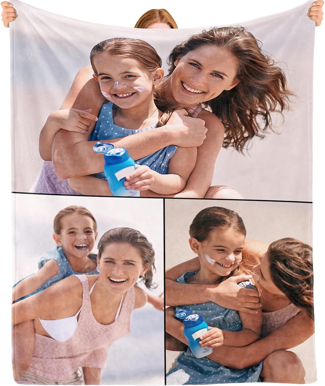 Mother's Day Gift Personalize the plaid with photos of yourself and mom or family. Save memorable moments and convey your love for your mother. As a Mother's Day gift, birthday gift, surprise mom. Advantages of our personalized coverage We choose a high-quality 300 GSM flannel with a weight of 300 grams per square metre. The density of flannel fleece is denser than that of 200GSM and 240GSM covers on the market, so our blankets are thicker, fluffier, and softer. Super fluffy and gentle on the skin. Expertly produced with double-needle stitching on the hems, thereby improving overall durability. 75x100cm —— Suitable for baby or pet 80 x 120 cm. 40" x 50" 102 x 150 cm. —— Child/Teenager 127 x 150 cm. 127 x 180 cm. ——Teens/Adult 150 x 200 cm. - Adult. 180 x 200 cm. - Adults Notes: 1. The higher the resolution of the downloaded image, the better the printing result will be 2. The personalized blanket is folded and vacuum packed for long shipping, the fluff may flatten and cause folds on the cover when you first open the package. It's normal. Wrinkles will gradually disappear over time, or wash it before use, the blanket will again be fluffy and thick. Care Instructions Machine wash or hand wash, use a delicate cycle with cold water, dry at low temperature or hang to dry. Quality Service: If you are not satisfied with our products, please feel free to contact us. We are ready to help you in every way possible.