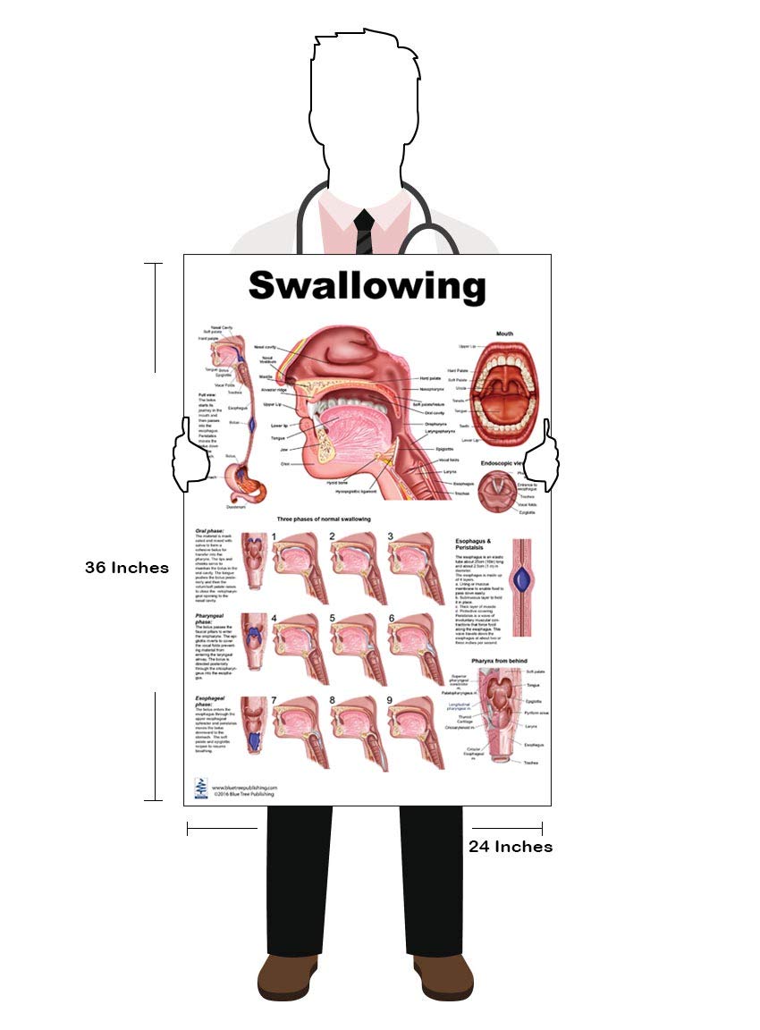 Three poster set including speech articulations, Swallowing and Larynx. Call-out illustrations and terms provide greater detail of specific parts. Step-by-step phases of normal swallowing are included. dry erase friendly