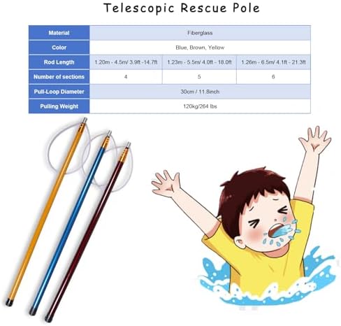 Introducing our premium emergency rescue pole, designed to enhance safety for swimmers in distress. This essential life-saving equipment is perfect for both personal and professional use, providing peace of mind in any water environment, such as pools, lakes, or beaches. Whether you're a lifeguard, a swim instructor, or simply a responsible pool owner, this rescue pole serves as a reliable tool for emergency situations. Crafted from durable fiberglass, our rescue pole is built to withstand harsh weather conditions, making it a long-lasting addition to your safety gear. The pole features a retractable design that extends from 1.20m to 6.5m, allowing for flexible use in various scenarios. It's lightweight and easy to carry, ensuring that you can quickly access it whenever needed. With bright color options, including blue, brown, and yellow, the pole is easily visible, helping you locate it swiftly during critical moments. Designed with a robust steel construction and a rubber-covered rope loop, this rescue pole can support a pulling weight of up to 120kg (264 lbs), making it suitable for a range of users. It's not just a safety device; it can also be utilized for teaching swimming techniques, making it versatile for both rescue and instructional purposes. Included in your purchase is one retractable rescue pole, ready to enhance your water safety strategy. Please note that measurements are approximate and may vary slightly. Ensure safety and preparedness with our reliable rescue pole, an invaluable asset for any water activity.