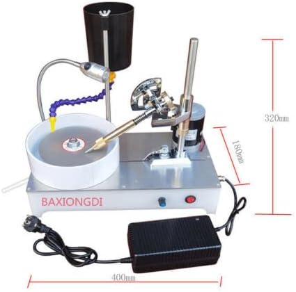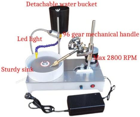 Feature: 1. Small size 2. Low noise 3. Infinitely variable speed 4. Precision and durable 5. Installed the water tank 6. Full copper motor 7. The handle can be parallel to the grinding disc 8. Led lighting 9. Sturdy sealed sink Specification: Voltage: AC 110-240V Power: 120W Upgrade Speed: 0-2800 RPM (adjustable) Grinding disc size: diameter 150mm Workbench size: 200x400mm Machine size: 400x180x320mm Weight: 9kg It is suitable for processing and grinding of knives, seals, natural gems, semi-precious stones, glass, jade, crystal, agate, garnet, peridot, such as interfaces, facets, etc.