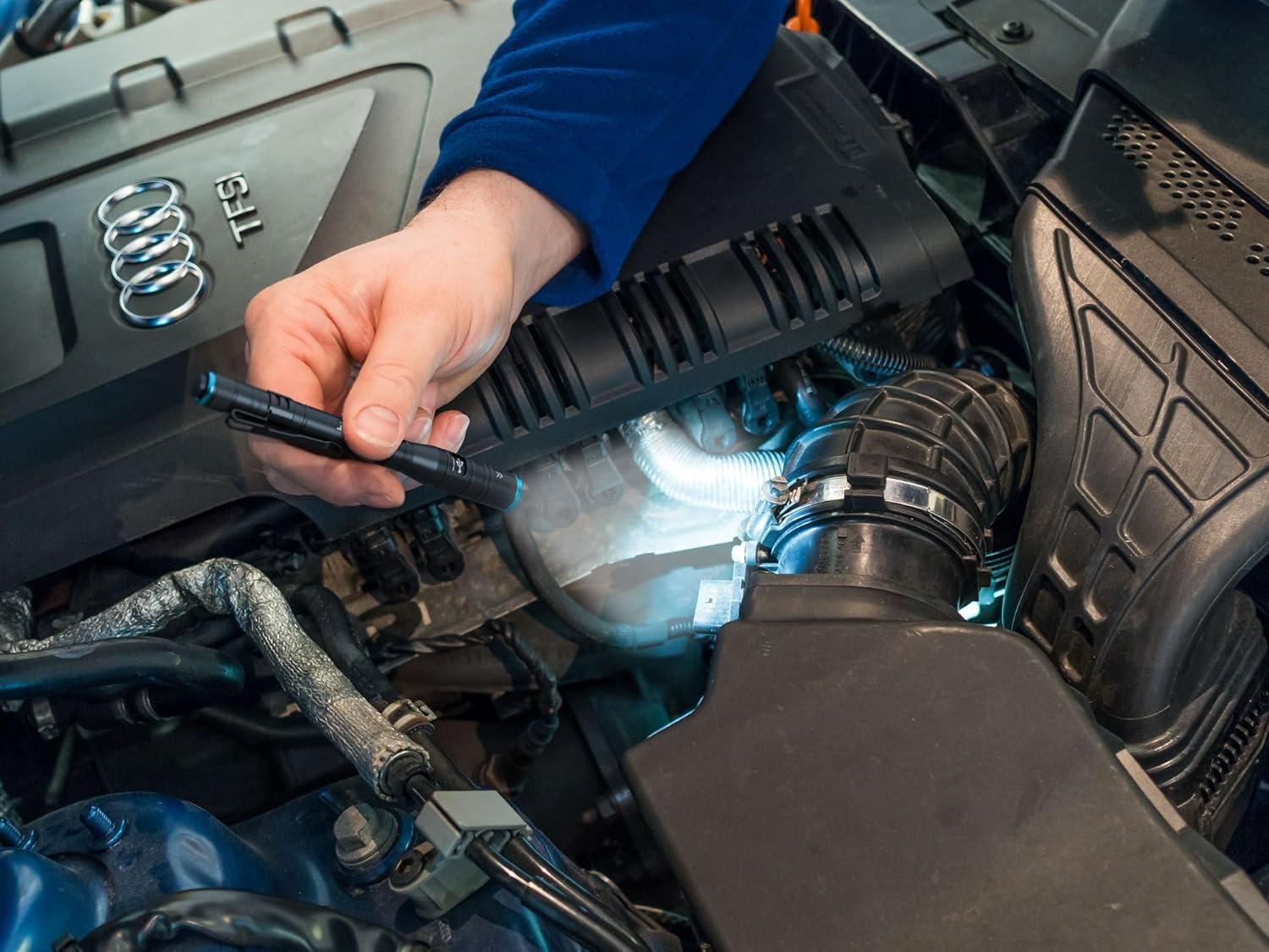The HAZET 1979-74 LED pen lamp impresses with its high light output, compact shape and flexible application possibilities. With up to 500 lumens and a lighting distance of 100 m, it ensures reliable lighting in the workshop, vehicle or outdoors. Three brightness levels can be selected directly via the on/off switch, even with gloves. The extendable lamp head allows you to switch from projector to focused spot light. The robust black anodized aluminum housing reliably protects the internal parts against dust and splashes of water in accordance with the IP44 protection type, while the impact protection according to IK08 provides additional safety. The lamp can be powered by the supplied 3.7V 750mAh Li-Ion battery or, alternatively, two AAA batteries. A USB-C charging socket as well as a colorful charging indicator are integrated. With a weight of only 61 g, a length of 158 mm and a convenient pen clip, the lamp is suitable for multiple applications in demanding conditions.