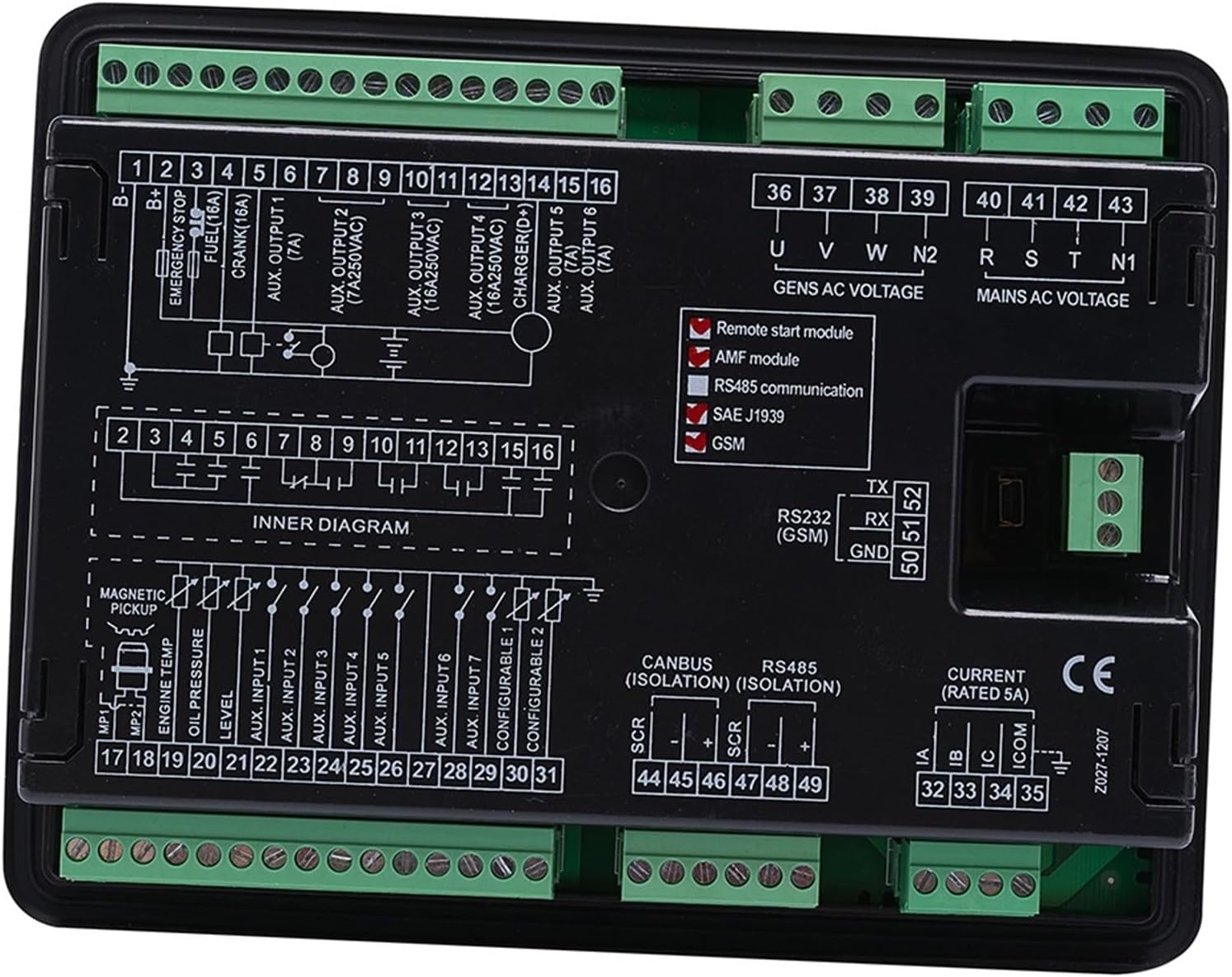 Control Modules7220ACN auto main failure generator contoller. AMF controllerProduct Code:6010051Power Supply:(8-35)VCase Dimensions:197*152*47(mm)Panel Cutout:186*141(mm)Operating Temp. :(-25~+70)Weight:0.75kgHGM7200/7100A series genset controllers are used for genset automation and monitor control system of single unit to achieve automatic start/stop, data measure, alarm protection and "three remote" (remote control, remote measuring and remote communication). The controller adopts large liquid crystal display () and selectable Chinese, English or other languages interface with easy and reliable operation.HGM7200/7100A controller adopts 32 bits micro-processor technology with precision parameters measuring, fixed value adjustment, time setting and threshold adjusting and etc. The majority of parameters can be set using front panel and all the parameters can be set using PC (via USB port) and can be adjusted and monitored with the help of RS485 ports. It can be widely used in a number of automatic genset control system with compact structure, simple connections and high reliability.PERFORMANCE AND CHARACTERISTICSHGM7X10, Auto Start Module, controls genset to start or stop automatically by remote start signal.HGM7X20, Auto Main Failure, updates based on HGM7X10, especially for automatic system composed by generator and mains.Main characteristicsWith ARM-based 32-bit CPU, highly integrated hardware, reliability level;132x64 with backlight, multilingual interface (including English, Chinese or other languages) which can be chosen at the site, making commissioning convenient for personnel; Improved wear-resistance and scratch resistance due to hard screen acrylic;Silicon panel and pushbuttons for better operation in high-temperature environment;RS485 communication port enabling remote control, remote measuring, remote communication via ModBus protocol (controller with RS485 port only); Equipped with SMS (Short Message Service) function. When genset is alarming, controller can send short messages via SMS automatically to max. 5 telephone numbers. besides, generator status can be controlled and checked using SMS (controller with GSM port only); Equipped with CANBUS port and can communicate with J1939 genset. Not only can you monitoring frequently-used data (such as water temperature, oil pressure, speed, fuel consumption and so on) of ECU machine, but also control starting up, shutdown , raising speed and speed droop via CANBUS port (controller with CAN Bus port only);Suitable for 3-phase 4-wire, 3-phase 3-wire, single phase 2-wire, and 2-phase 3-wire systems with voltage 120/240V and frequency 50/60Hz;Collects and shows 3-phase voltage, current, power parameter and frequency of generator or mains.For Mains, controller has over and under voltage, over and under frequency, loss of phase and phase sequence wrong detection functions; For generator, controller has over and under voltage, over and under frequency, loss of phase, phase sequence wrong, over and reverse power, over current functions.3 fixed analog sensors (temperature, oil pressure and liquid level);2 configurable sensors can be set as sensor of temperature or fuel level;Precision measure and display parameters about Engine,Protection: automatic start/stop of the gen-set, ATS(Auto Transfer Switch) control with perfect fault indication and protection function;All output ports are relay-out;Parameter setting: parameters can be modified and stored in internal EEPROM memory and cannot be lost even in case of power outage; most of them can be adjusted using front panel of the controller and all of them can be modified using PC via USB or RS485 ports. More kinds of curves of temperature, oil pressure, fuel level can be used directly and users can define the sensor curves by themselves;Multiple crank disconnect conditions (speed sensor, oil pressure, generator frequency) are optional;Widely power supply range (8~35)V, suitable to different starting battery voltage environment;Event log and real-time clock.Scheduled start & stop generator can be set as start genset once a day/week/month whether with load or not; also can be set as customer weekly in which users can set the start time separately from Monday to Sunday);Selectivity configuration. Users can choose different configuration by input port.Can be used on pumping units and as an indicating instrument (indicate and alarm are enable only, relay is inhibited );With maintenance function. Actions (warning or shutdown) can be set when maintenance time out;All parameters used digital adjustment, instead of conventional analog modulation with normal potentiometer, more reliability and stability;Waterproof security level IP55 due to rubber seal installed between the controller enclosure and panel fascia;Metal fixing clips enable perfect in high temperature environment; Modular design, self extinguishing ABS plastic enclosure, pluggable connection terminals and embedded installation way; compact structure with easy mounting.HGM7200/7100A series genset controllers are used for genset automation and monitor control system of single unit to achieve automatic start/stop, data measure, alarm protection and "three remote" (remote control, remote measuring and remote communication). The controller adopts large liquid crystal display () and selectable Chinese, English or other languages interface with easy and reliable operation.HGM7200/7100A controller adopts 32 bits micro-processor technology with precision parameters measuring, fixed value adjustment, time setting and threshold adjusting and etc. The majority of parameters can be set using front panel and all the parameters can be set using PC (via USB port) and can be adjusted and monitored with the help of RS485 ports. It can be widely used in a number of automatic genset control system with compact structure, simple connections and high reliability.PERFORMANCE AND CHARACTERISTICSHGM7X10, Auto Start Module, controls genset to start or stop automati