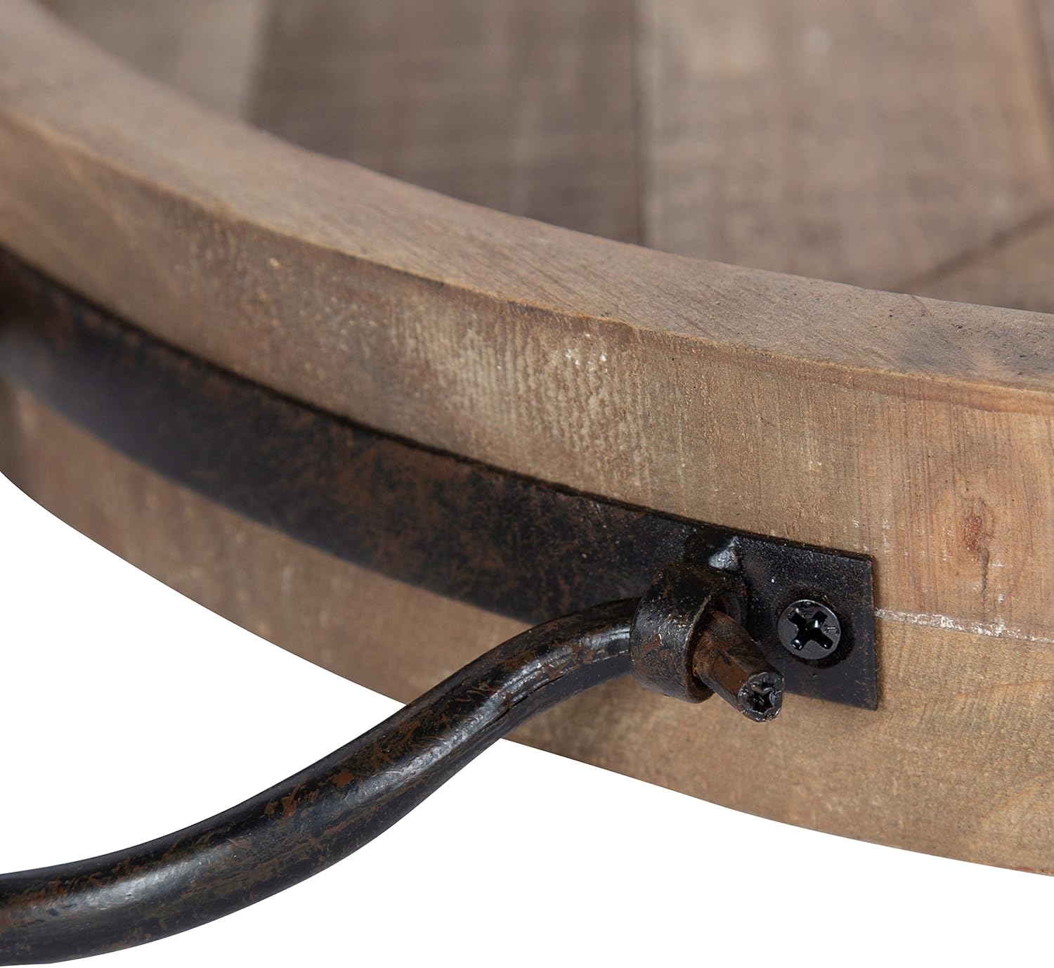 Decorate your home in rustic modern style with this circular wooden tray with black metal handles. Place this charming tray on your coffee table to hold a vase of flowers or on your dining table as a centerpiece. It can also be used as a decorative accent on an entrance console table for a great place to throw your keys, wallet, etc. Arrange an assortment of beautiful jars on it for a unique look in any room of the home. This accent tray is constructed of solid wood using two-toned weathered finishes to make a handsome square-in-a-square pattern. It measures 18 inches in diameter by 2 inches high and arrives completely assembled and ready for use. Decorate and organize in rustic chic style in any room of the home with this lovely accent tray.