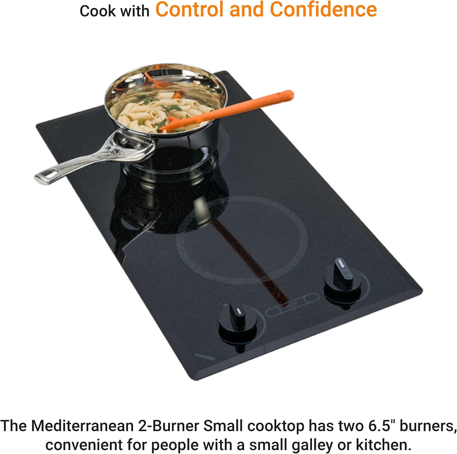 Elevate your culinary experience to new heights with the revolutionary Kenyon B41596 Mediterranean 2-burner small electric cooktop. Prepare to unleash your creativity in the kitchen like never before, thanks to its exceptional performance, versatile features, easy-to-clean and durable ceramic glass top, and space-saving design.Designed for modern chefs and passionate home cooks alike, this electric cooktop boasts two powerful 6.5" burners, allowing you to cook multiple dishes simultaneously. With its elegant black color and the ability to handle a maximum 2400-Watt load, this cooktop delivers high heat for flawless results every time. Whether it's a boat galley, an RV kitchen, or a cozy tiny home, this cooktop enhances your cooking potential in any space.Our 208V small electric cooktop offers effortless operation with its user-friendly knob controls, providing a seamless cooking experience. Safety is our priority, and that's why we've included features like the HOT indicator light to keep you informed and prevent accidental burns.The sleek and sloping silhouette of this cooktop adds a touch of sophistication to any countertop, seamlessly blending with your kitchen decor. Unleash your culinary creativity with our 2-burner small electric cooktop and enjoy the convenience of this exceptional appliance.