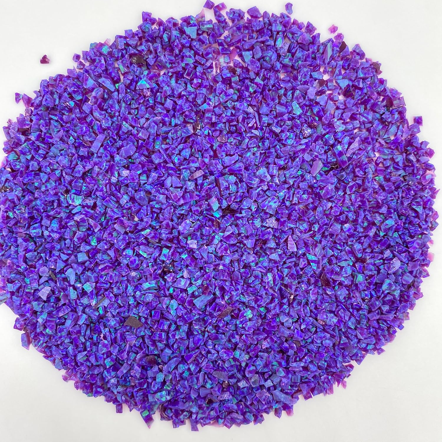 Our crushed Lavender Purple Opal shines a ravishing purple. The striking features create a radiant inlay material that is constantly shifting colors. The primary color of our crushed lavender purple opal is purple with hints of green and blue. Use this crushed opal for inlay in your next ring design! Purchase includes 1 gram or enough fragments for roughly 5 rings. Size of opal fragments are between 2-3mm.
