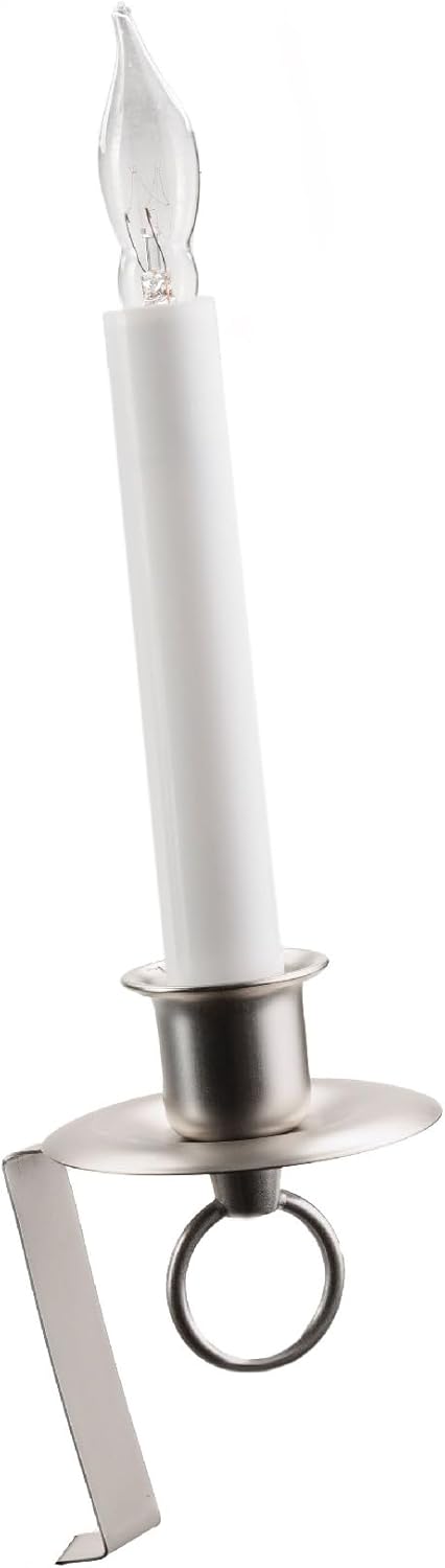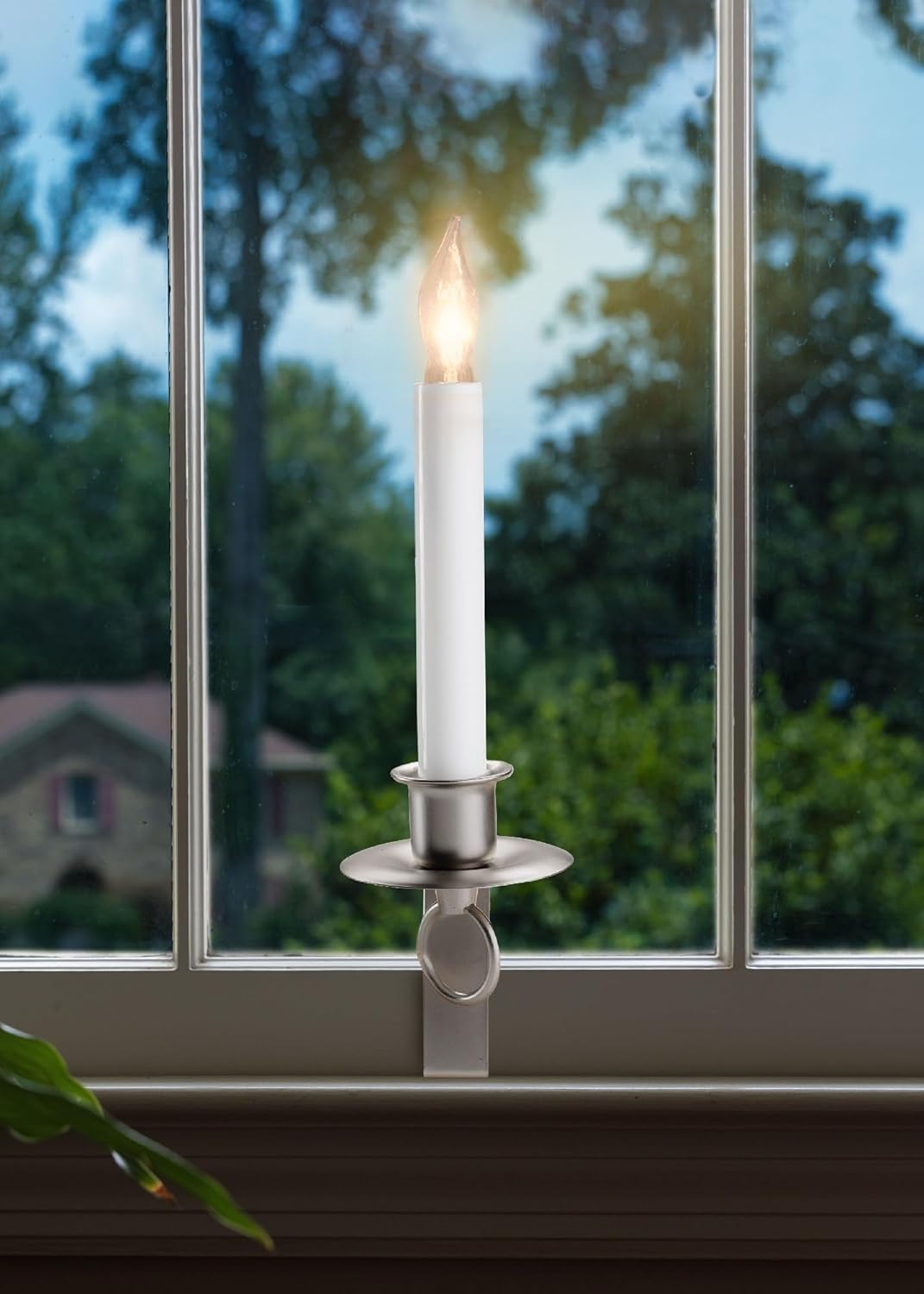 Add a warm and inviting glow to your home this holiday season with this set of 4 pre-lit Christmas window candles. Featuring white candles and classic pewter brackets, these Christmas candles are perfect for windows without sills or areas needing added security. The clear incandescent bulbs emit a soft, elegant light. With automatic sensors, the candles illuminate at dusk and turn off at dawn, offering effortless ambiance. Product Features:. Set of 4 Christmas window candles. White candles with pewter brackets. Cool burn flame tip incandescent bulb. Light sensor turns candles on/off automatically. 36" lead cord. Contains 1 plug with no end connector. Cannot be connected with other lighted items. Each candle uses 5-watt max candelabra base UL classified bulbs. 120 volts, 60 hertz, .042 amps, 5 watts. UL certified and approved for indoor use only Dimensions: 12"H x 3"W x 4"D. Material(s): metal/plastic/glass bulbs