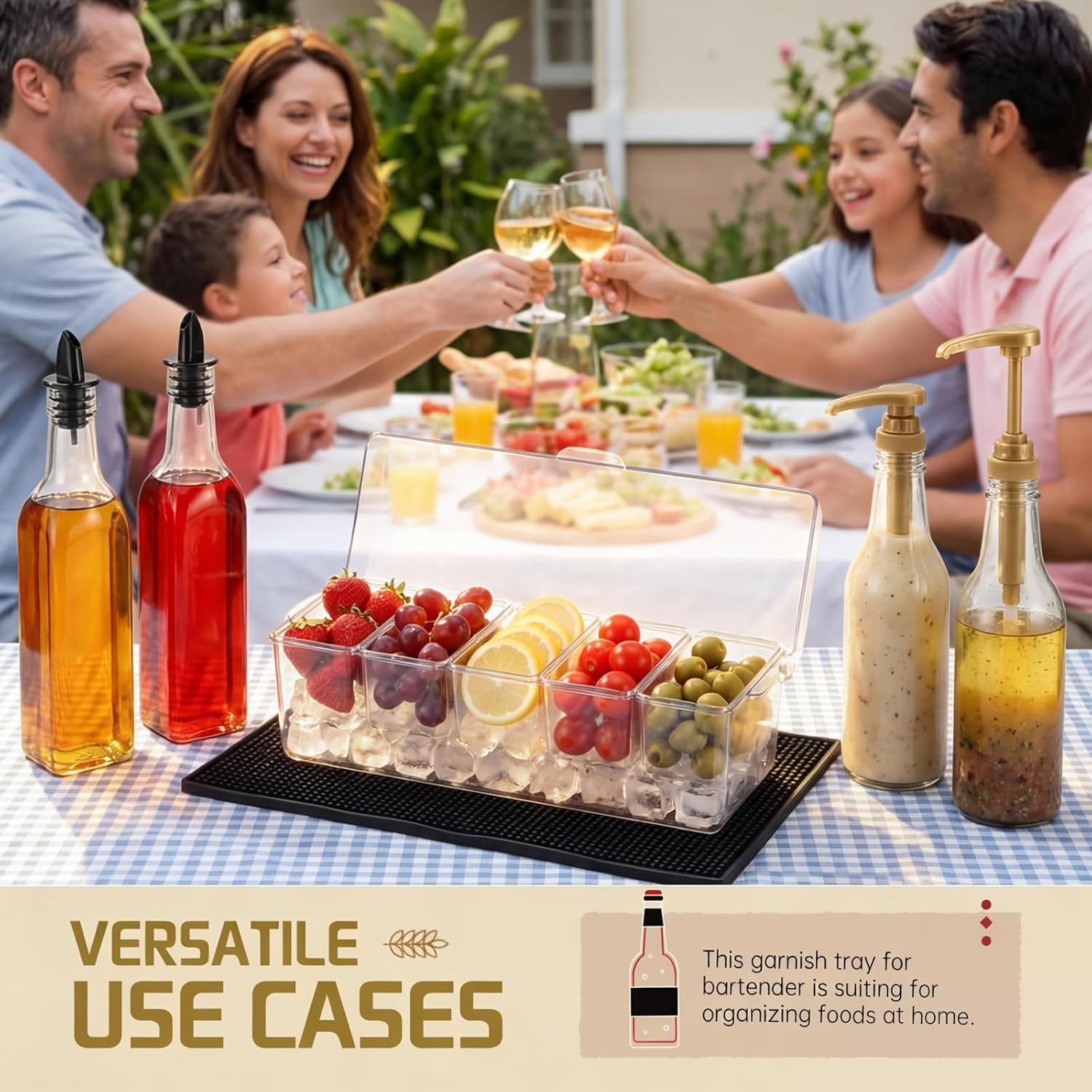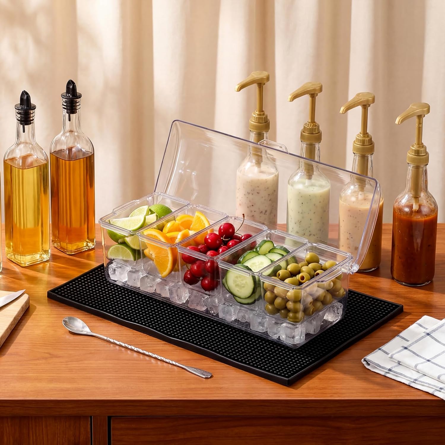 Features: Durable Materials: Constructed from acrylic and metal, these supplies are designed for longevity and durability, ensuring they withstand frequent use in busy environments Elegant Aesthetic: Available in sleek black, clear, and gold finishes, the bar condiment caddy add a touch of elegance to any setting, enhancing your bartending experience and impressing your guests Specifications: Material: acrylic, Metal Color: black, clear, gold Size: the Plastic wine stopper is approximately 2.56 x 1.18 inches / 6.5 x 3 cm The Gold Coffee Syrup Pump is approximately 14.96 inches / 38 cm The Draining mat is approximately 17.72 x 11.81 inches / 45 x 30 cm The Ice Chilled Condiment Caddy is approximately 15.75 x 5.91 x 5.51 inches / 40 x 15 x 14 cm, Each compartment (5.2 x 2.64 x 2.83 inches) Package includes: 1 x Ice Chilled Condiment Caddy 4 x Gold Coffee Syrup Pump 6 x Liquor pour spout 1 x Black draining mat Notes: Manual measurement, please allow slight errors on size. The color may exist a slight difference due to different screen displays