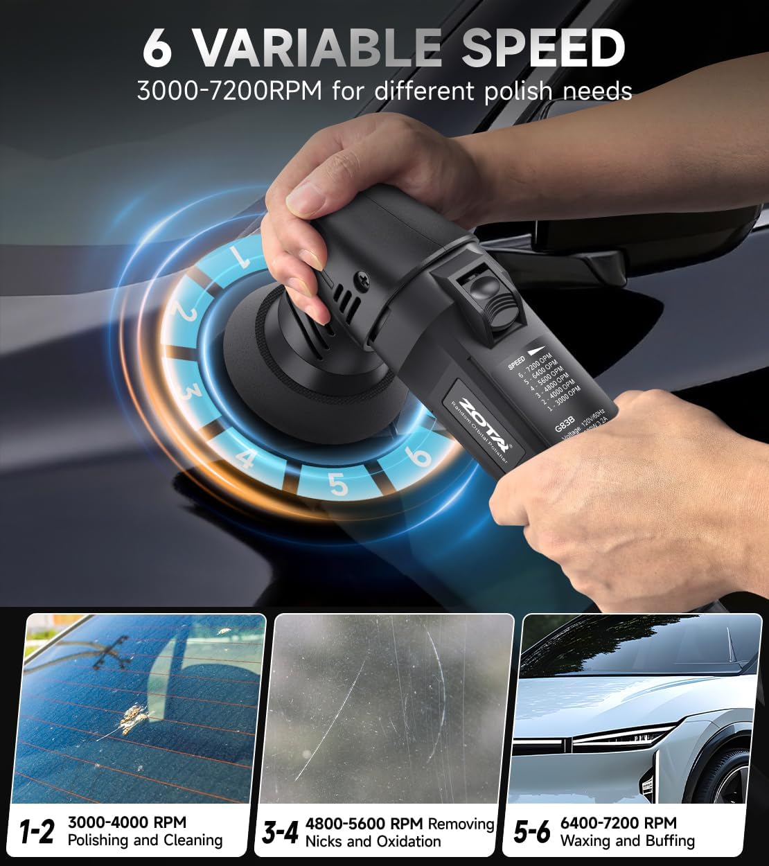 | Included Components | Polisher, 3" backing plate, 2" backing plate, 3" sponge pads (2), 3" wool pad, 2" sponge pads (4), 2" microfiber fast finishing pad, H17 open wrench, Carbon brushes (2), Microfiber towel |