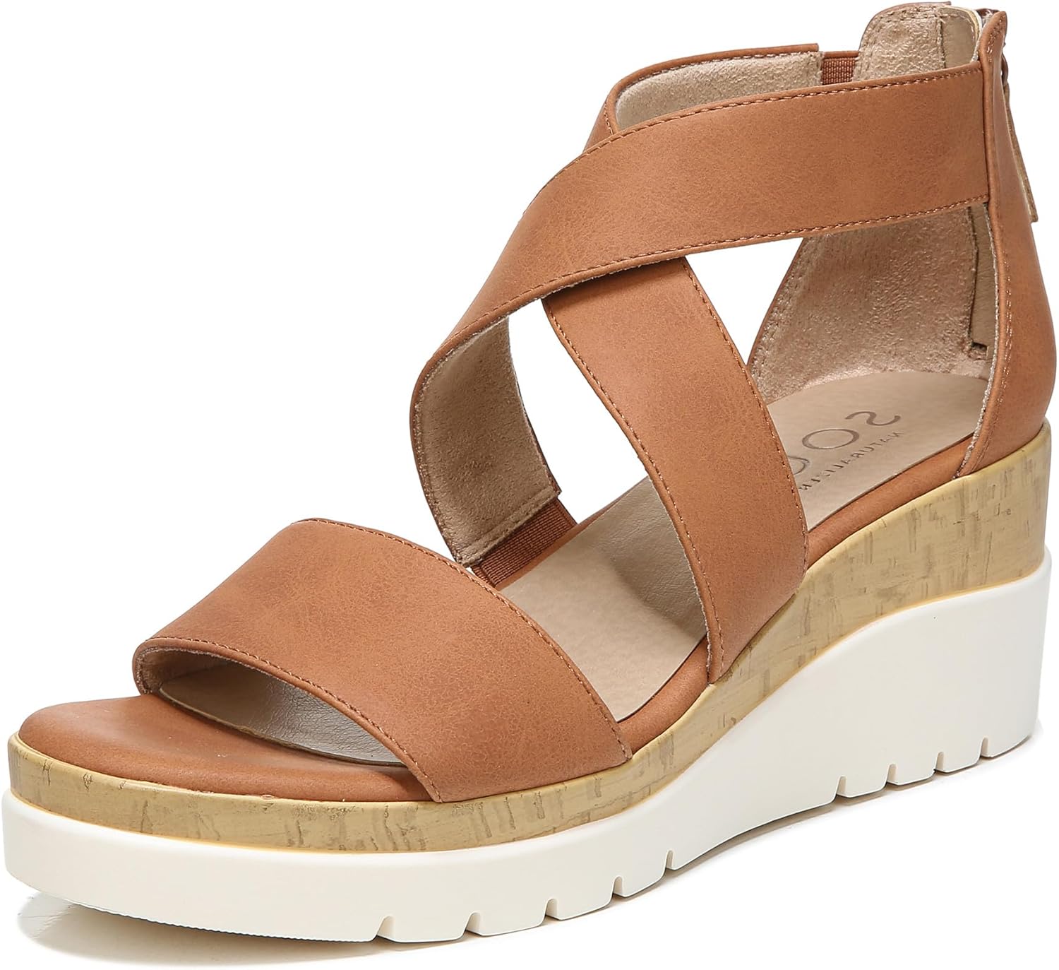 For your easy-going summery style. Crisscross straps complete the vamp of this ultra-comfy minimal sandal for women from SOUL Naturalizer. Elevated by a cork trim wedge and white lug bottom, it's a wear-everywhere style. Inspired by the way you live. Sport sandal with layered wedge heel and crisscross straps. Manmade or fabric/manmade upper with an open toe. Back zip closure. All-Thru Comfort: soft foam lining, arch support with memory foam, lightweight and flexible outsole. Lug sole. 2 3/4 inch(es) heel for comfortable walking and everyday wear. Consciously packaged: 100% of our shoe boxes are made of 80% recycled paper + soy-based ink. Designed using sustainable materials. WHY YOU'LL LOVE IT: Ingenious relaxed utility. Unstructured, uncomplicated styles thoughtfully designed with your comfort in mind so you can live in the moment. Available in an inclusive size range of tough-to-find sizes and widths for a better fit and feel.