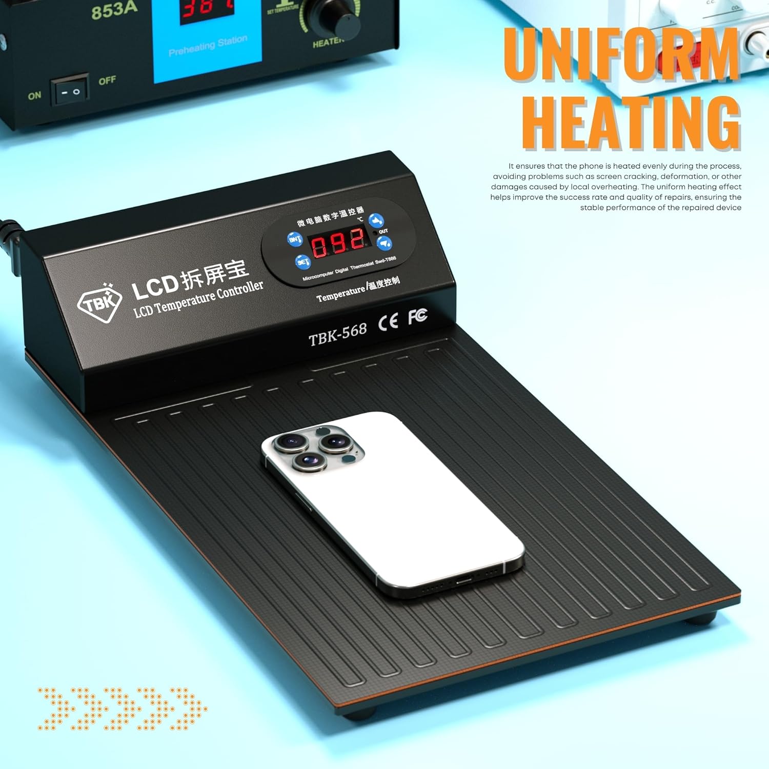 SPECIFICATION-Item Dimensions: 19*33*8in-Item Weight: 1.92lbs-Power: 350W-Voltage: 110/220VPACKAGE:1* Heating PadThe Heating Pad is a versatile and essential tool designed for efficient phone and tablet repair. With a maximum heating temperature of 120℃, it ensures optimal performance for softening adhesives during screen removal or reassembly. For safe and effective operation, it is recommended to use the device at 80℃.This phone heating separator is compatible with a wide range of devices, including phones and tablets up to 12.9 inches, making it suitable for most modern gadgets. Its voltage conversion capability allows it to operate between 110V and 220V, ensuring fast, stable, and consistent heating for precise adhesive softening.The heating pad is equipped with a built-in temperature display screen, enabling you to monitor real-time temperature adjustments. This feature ensures accuracy and safety during disassembly and reassembly processes, reducing the risk of damage to delicate components.Compact and portable, the device measures 19*33*8in, making it an ideal choice for home use or small workspaces in mobile phone repair shops. Its lightweight design and efficient performance make it a must-have tool for both professionals and DIY enthusiasts.Whether you're repairing a cracked screen or replacing internal components, this heating pad delivers reliable performance, ensuring a smooth and hassle-free repair experience.