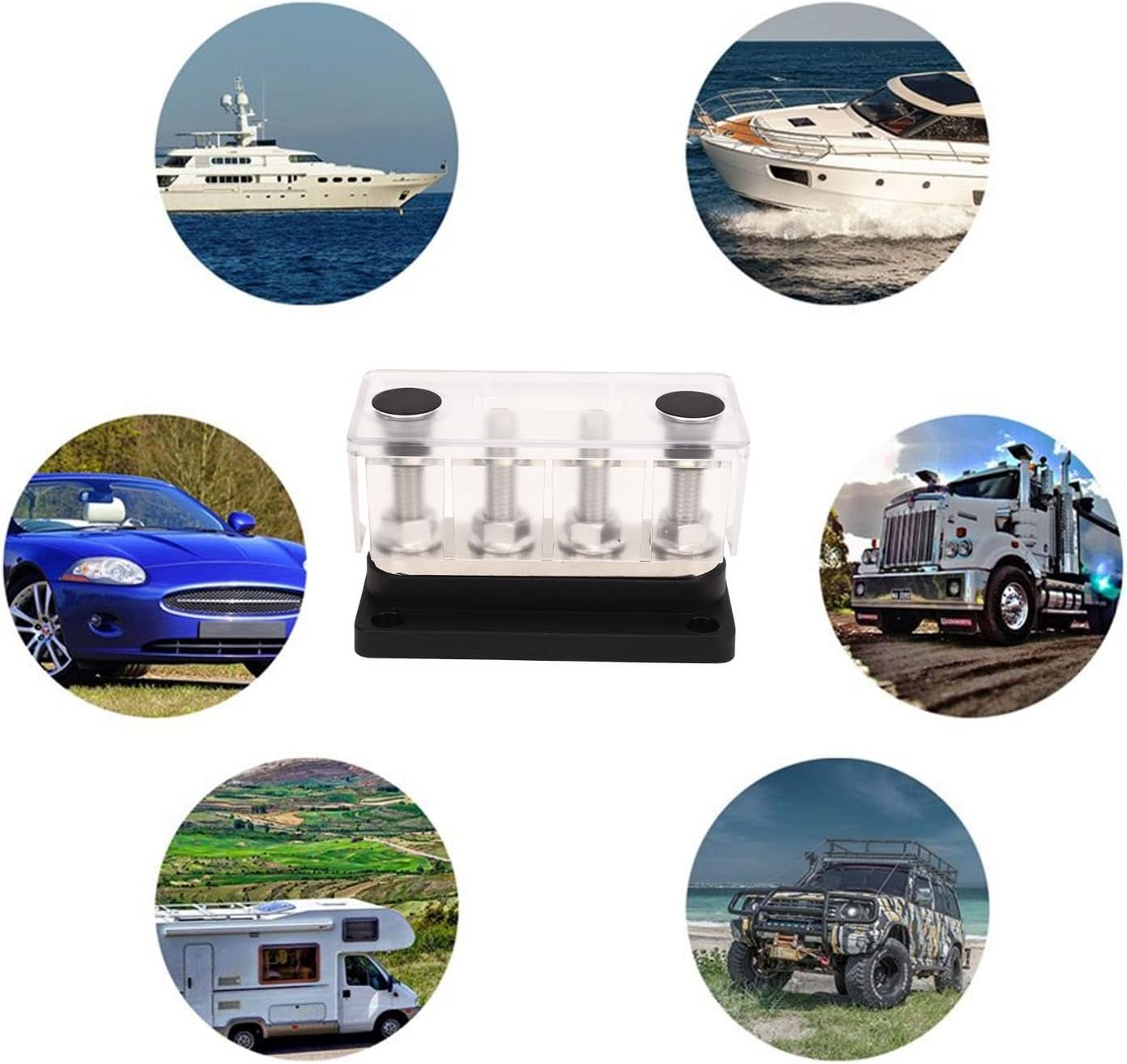 Item Type: Power Distribution BlockMaterial: ABS, Zinc Alloy, BrassMaximum Voltage: DC48VContinuous Current: 300AStud Size: 4 x M10 (M10 size = 3/8inch)Function: Bring the wire harness together and reasonably store the wire inside the car or boatScope of Application: Cars, RVs, ships, yachts and other power systemsPackage List:1 x Power Distribution Block1 x Cover4 x Screw