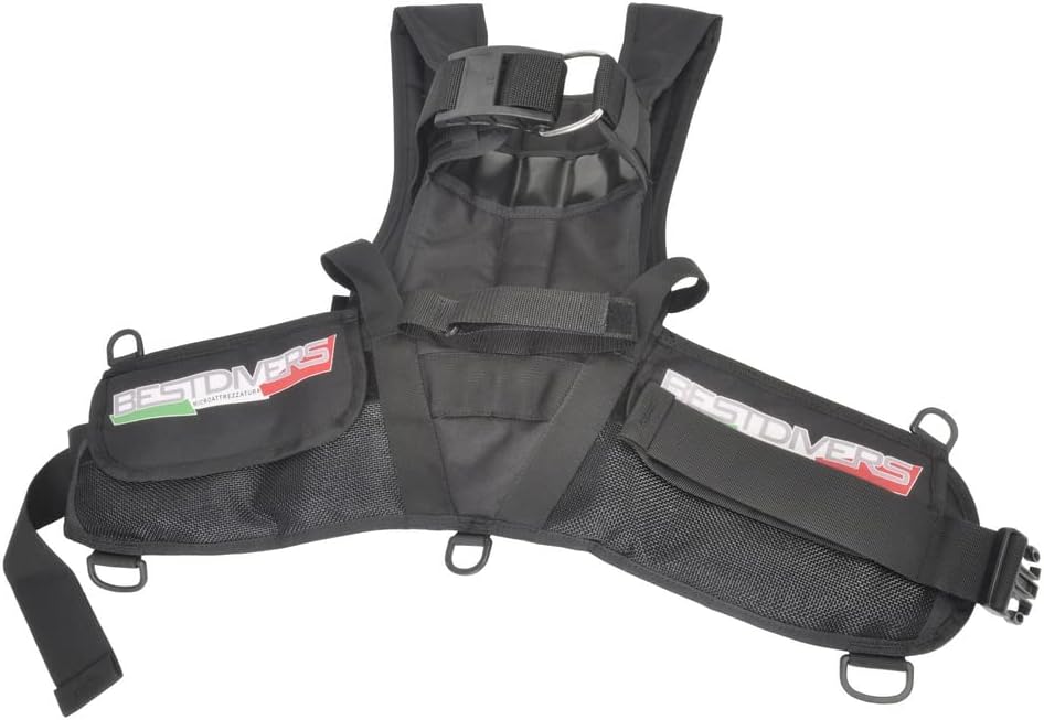 BOMBLE BACKBACKS MADE IN ITALY An exclusive Best Divers production entirely assembled and tested in our workshops. Specifications: Quick release adjustment buckles 50 mm black tape padded shoulder straps and back strap jacket for fixing cylinder 5/7 litres pockets with Velcro closure 5 attachment rings