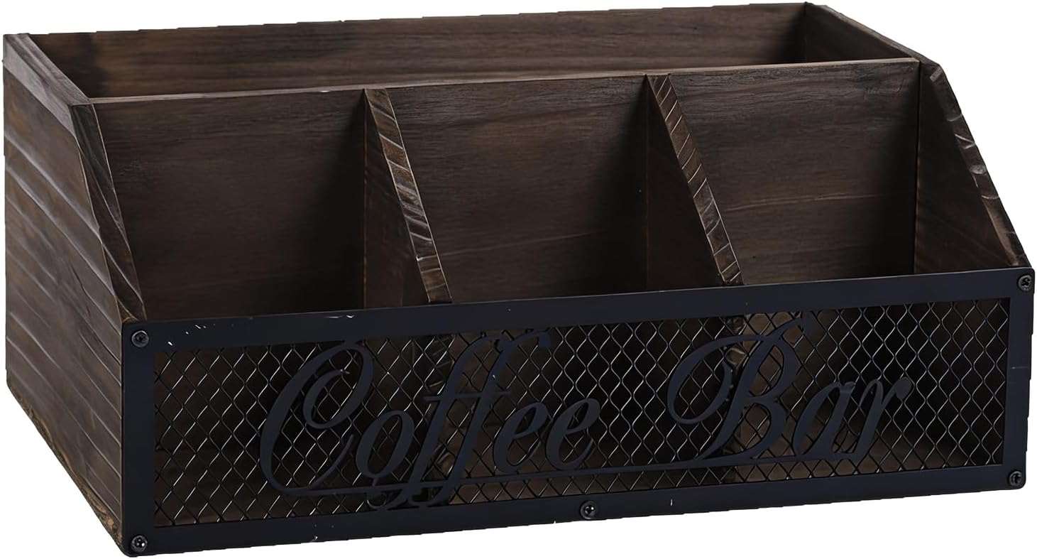 Vintage Coffee Supplies Holder Featuring Open Pattern For Tea Sugar Packets And Creamer Dispensers Features: Organized Storage: Features adjustable dividers and spacious compartments to neatly arrange beverage pods, tea bags, tall cups, ingredient jars, and other accessories, keeping your counter tidy and efficient Rural Industrial Design: Combines sturdy metal panels with vintage inspired lettering and warm brown finishes for a blend of nostalgic charm and modern functionality, complementing various decor styles while providing easy access to stored items Easy Assembly with Included Hardware: Comes with clear illustrated instructions, fasteners, and mounting tools for simple installation, requiring denial extra parts—perfect for beginners to assemble Sturdy & Secure Construction: Made with wood and reinforced metal panels for strength, featuring a textured base to minimize movement, ensuring dependable for daily use Versatile Placement preferences: Sized to fit kitchen counters, home beverage areas, workplace break rooms, or commercial spaces ( 31.5x21x13.5cm), conveniently placed near brewing equipment for immediate access to additives, sweeteners, and tools Specifications: Substance: wood Product size: 31.5x21x13.5cm ( particulars as shown) Main functions: kitchen club storage, offices storage Package Includes: Storage rackx1 Note: Before using the accessory, please check it is compatible Pay attention to the storage methods