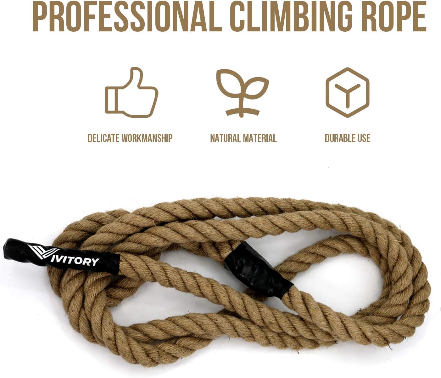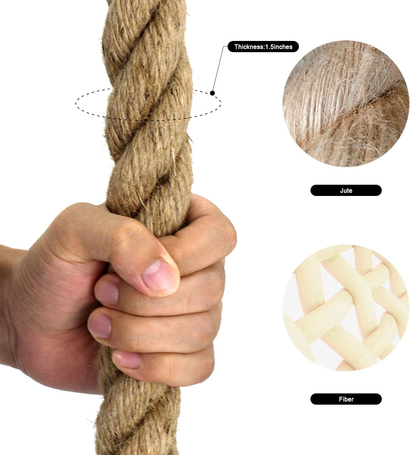 Professional-grade Gym Climbing RopeOur climbing rope make you love fitness and sports. Great building your body, build your muscles and burning fat.Exercise and Emergency SafetyThis is a professional-grade rope that can be used in your strength and cardio regimen or can beplaced in your emergency safety kit for fire escape and disaster survival.Ideal Climbing Toy for Kids Boys and GirlsIt's great for kids to climbing in garden, playground. Also can used as battle rope for kidsEasy to Install and FixEasy attachment nearly anywhere. It can be used on a tree branch or ceiling beam by throwing over the branch/beamDetailMaterial: HempRope Diameter: 1.5"Rope Length: 10ft, 15ft, 25ft and 30ft Handle Length: 7.5"