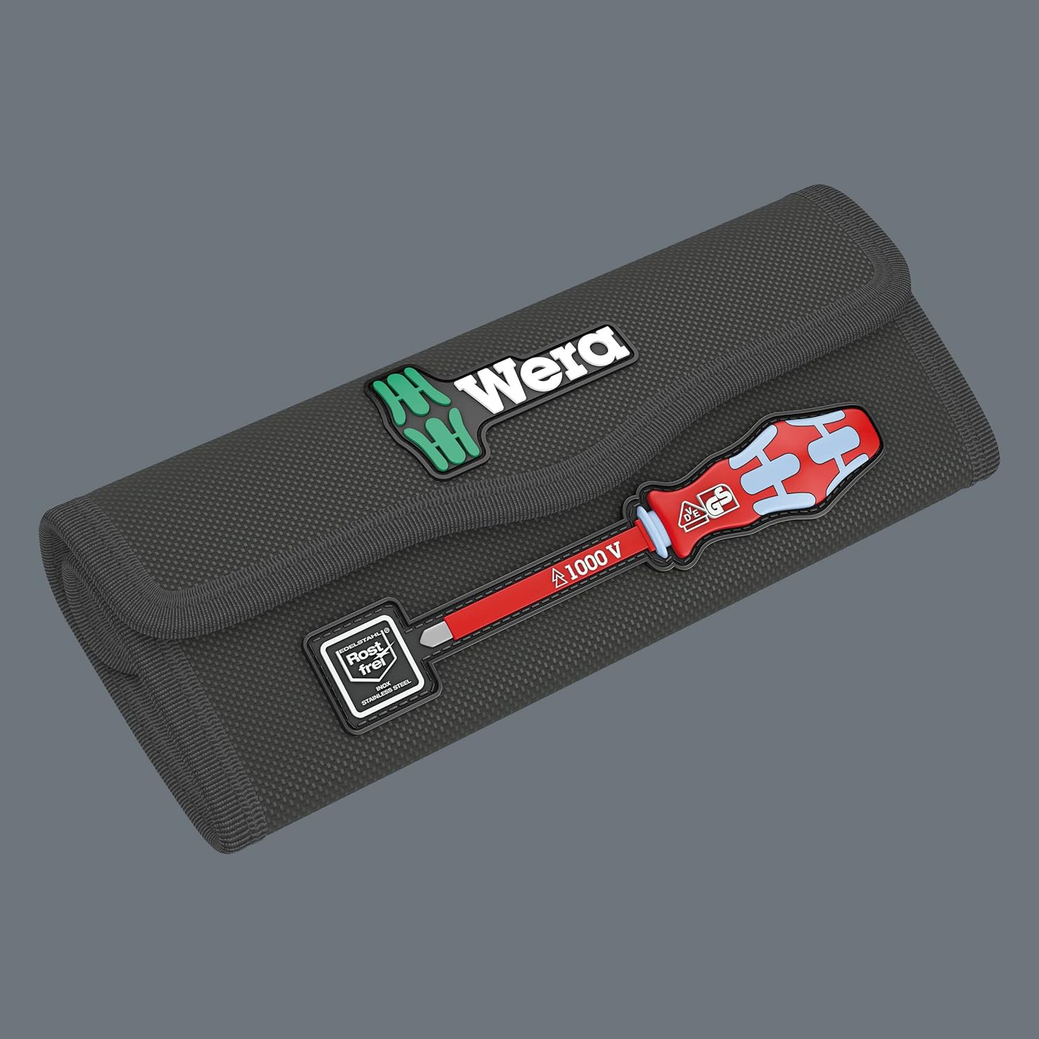 7 VDE stainless blades, some of which with reduced blade diameter, so that even low-lying screw and spring elements can be easily reached and operated. One 3817 VDE Kraftform bitholding screwdriver for ergonomic screwdriving. In a robust pouch. Individually tested tools as per IEC 60900. Individually tested at 10,000 V for safe working at the approved voltage of 1,000 V. Wera's stainless steel tools are vacuum ice tempered and therefore have the hardness and strength properties required for screw connections. Industrial use is possible without restrictions. The pouch is suitable for attachment to walls, shelves, workshop trolleys and the Wera 2go system thanks to the hook and loop fastener system on the back.Includes: 1x Kraftform Kompakt VDE Stainless 8 extra slim 1, 8 pieces; 1x 3817 VDE Kraftform Stainless blade-holding handle: 9x98; 4x Kraftform Kompakt VDE 3067 i TORX®, stainless: TX 8x154, TX 9x154, TX 10x154, TX 30x154; 3x Kraftform Kompakt VDE 3067 iS TORX®, stainless: TX 15x154, TX 20x154, TX 25x154; 1x Hook and Loop Fastener Strip 70: 70.0x50.0