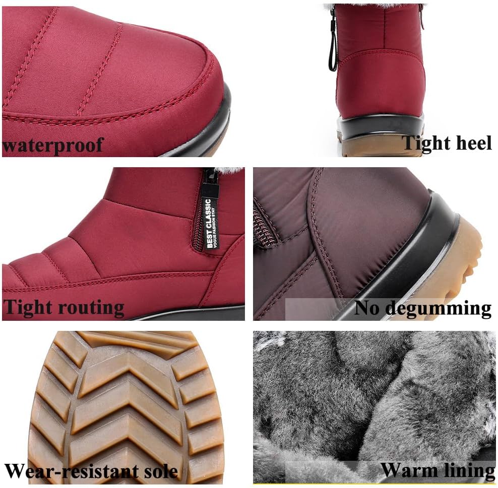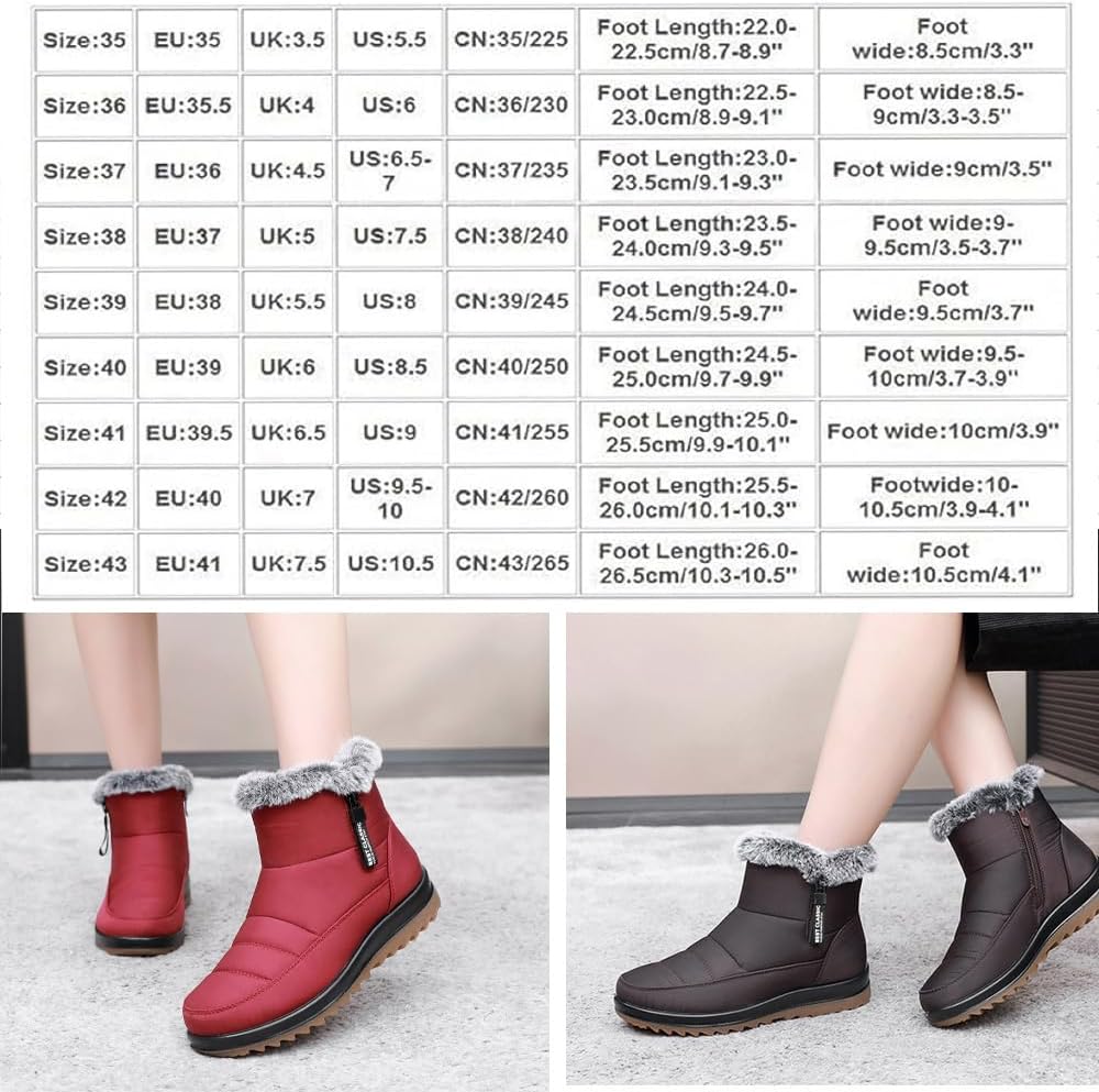 Snow Boots for Women Waterproof Non Slip,Fleece Warm Fur Lined Ankle Boot with Zipper, Lined Anti-Slip Booties, Comfortable Outdoor Fleece Shoes Feature:Waterproof & slip-resistant design for cold and wet conditionsWarm fleece lining and faux fur to keep your feet cozyEasy side zipper for quick on and off with adjustable fitPerfect for outdoor activities, from hiking to snowy strollsMid-calf height for added warmth and protection in winterSpecification:Name: Women's Winter Waterproof Non-Slip Fleece Snow BootsMaterial: Waterproof Fabric, Fleece Lined, Oxford SoleColor: Red, Black, BrownFunction: Waterproof, non-slip, warmToe Shape: RoundHeel Shape: WedgeStyle: Side ZipperColors: Black, Brown, BurgundySizes: 35, 36, 37, 38, 39, 40, 41Package included:1 Pair * Women's Winter Waterproof Non-Slip Fleece Snow Boots